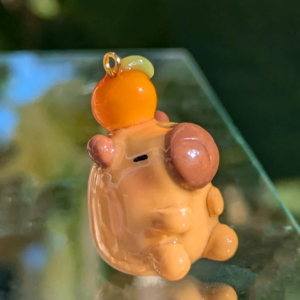 Portachiavi di argilla a forma di capibara con arancia sulla testa